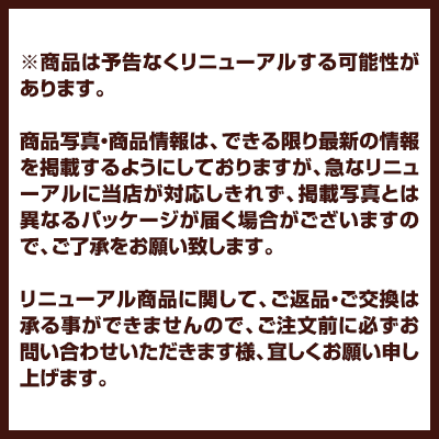 同梱可 ●原材料 トリ肉(チキン、ターキー)、コーングルテン、コーンスターチ、セルロース、米、トマト、亜麻仁、ココナッツ油、植物性油脂、ポークエキス、魚油、ニンジン、小麦、アミノ酸類(スレオニン、タウリン、トリプトファン、メチオニン、リジン)、ミネラル類(カルシウム、ナトリウム、カリウム、クロライド、銅、鉄、マンガン、セレン、亜鉛、イオウ、ヨウ素)、乳酸、ビタミン類(A、B1、B2、B6、B12、D3、E、ベータカロテン、ナイアシン、パントテン酸、葉酸、ビオチン、コリン)、カルニチン、酸化防止剤(ミックストコフェロール、ローズマリー抽出物、緑茶抽出物) ●成分 たんぱく質34.0%以上、脂質10.0%以上15.5%以下、粗繊維13.0%以下、灰分7.0%以下、水分8.5%以下