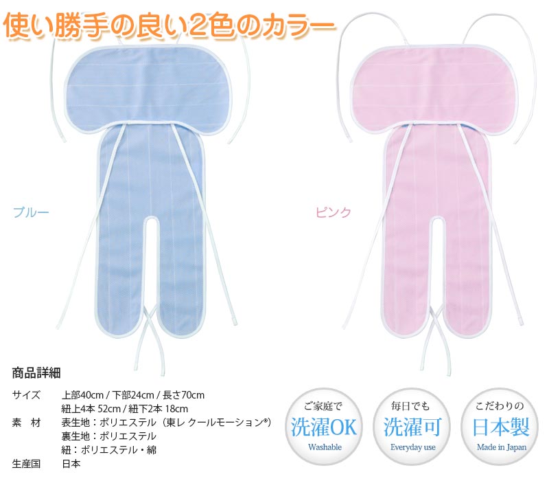 商品説明素材表地/ポリエステル100%(東レ クールモーション®素材使用)裏地/ポリエステル100% 通し紐/ポリエステル・綿サイズ上部布 40cm(紐4本52cm)下部布 24cm(紐2本18cm)長さ 70cm カラーブルー・ピンク 製造縫製、パッケージともに日本製特徴 蒸し暑い日のお子様のお出かけ時にもさらさら快適空間を チャイルドシートやベビーカーに座っているお子様の背中やお尻、太もものあたりに汗がじんわりにじんでいませんか? お子様のお出かけ時の環境も整えてあげたいですよね。